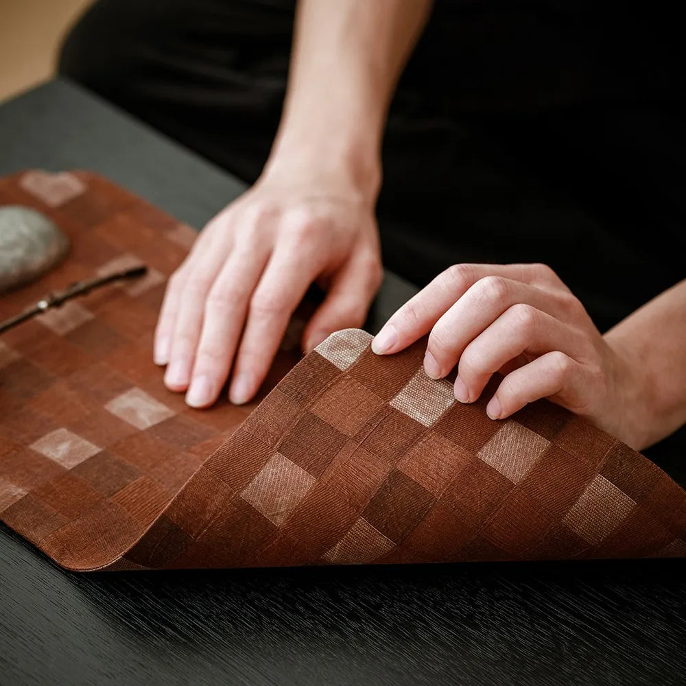 The Vintage Chinese Double-Sided Rectangular Tea and Cup Mat (Plaid Weave) is a handcrafted piece of cultural elegance, woven from luxurious Gambiered Canton Gauze (a 65% mulberry silk and 35% cotton blend). Its unique plaid pattern is artfully handwoven, highlighting the rich heritage of Xiangyunsha textiles. The silk-infused fabric feels incredibly smooth and soft, while plant-based natural dyes give the mat a subtle, radiant sheen in an understated, earthy palette. The reversible design features concealed stitching, creating a seamless, elegant finish on both sides for versatile use.